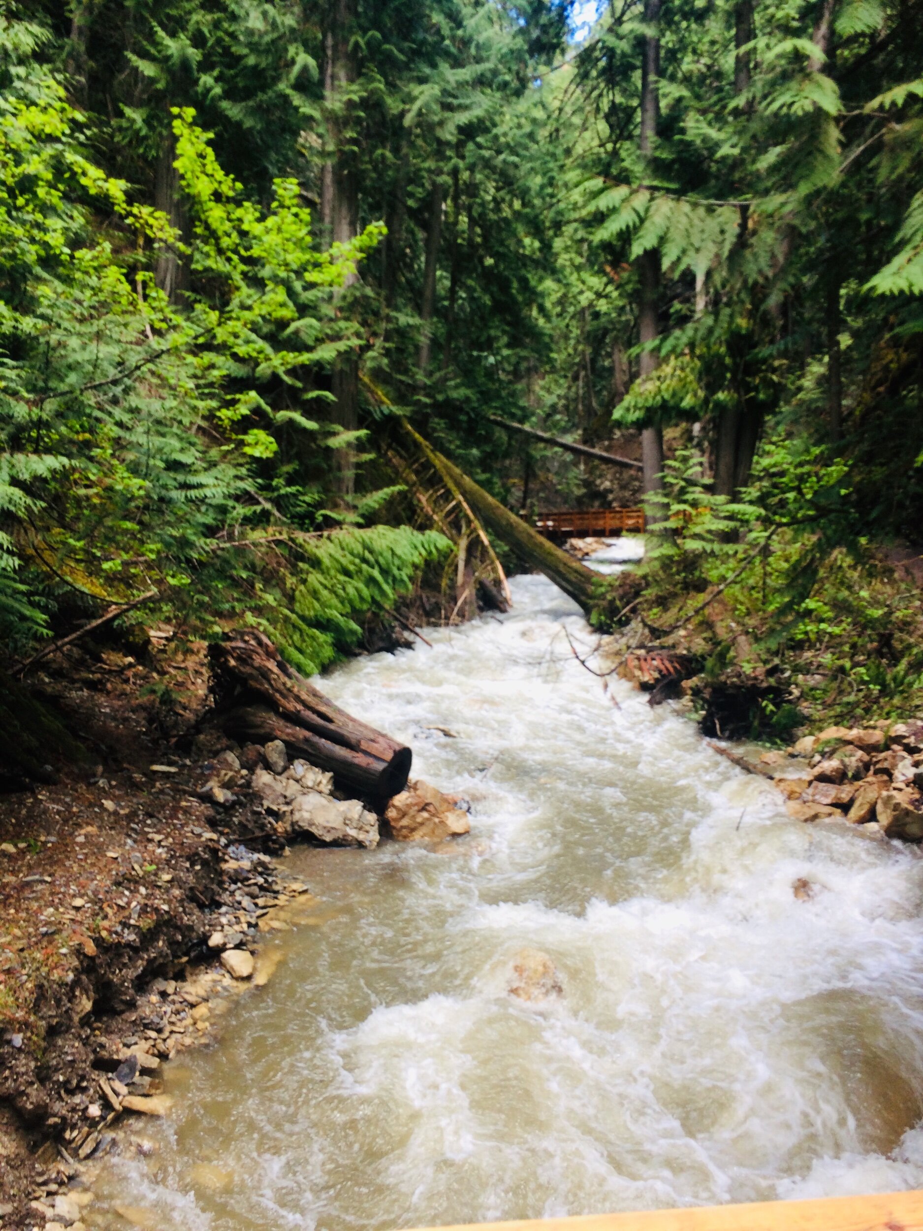 The Upper Trail: This is where you really see the history as there is a replica flume, original remnants, and a beautiful timber stair set. The trails runs through an incredibly rich and lush old-growth forest and follows along the gorgeous creek. There are several small “beaches” along the way to stop at and there are seven unique and newly constructed bridges! There is also the impressive Bear Creek Falls.