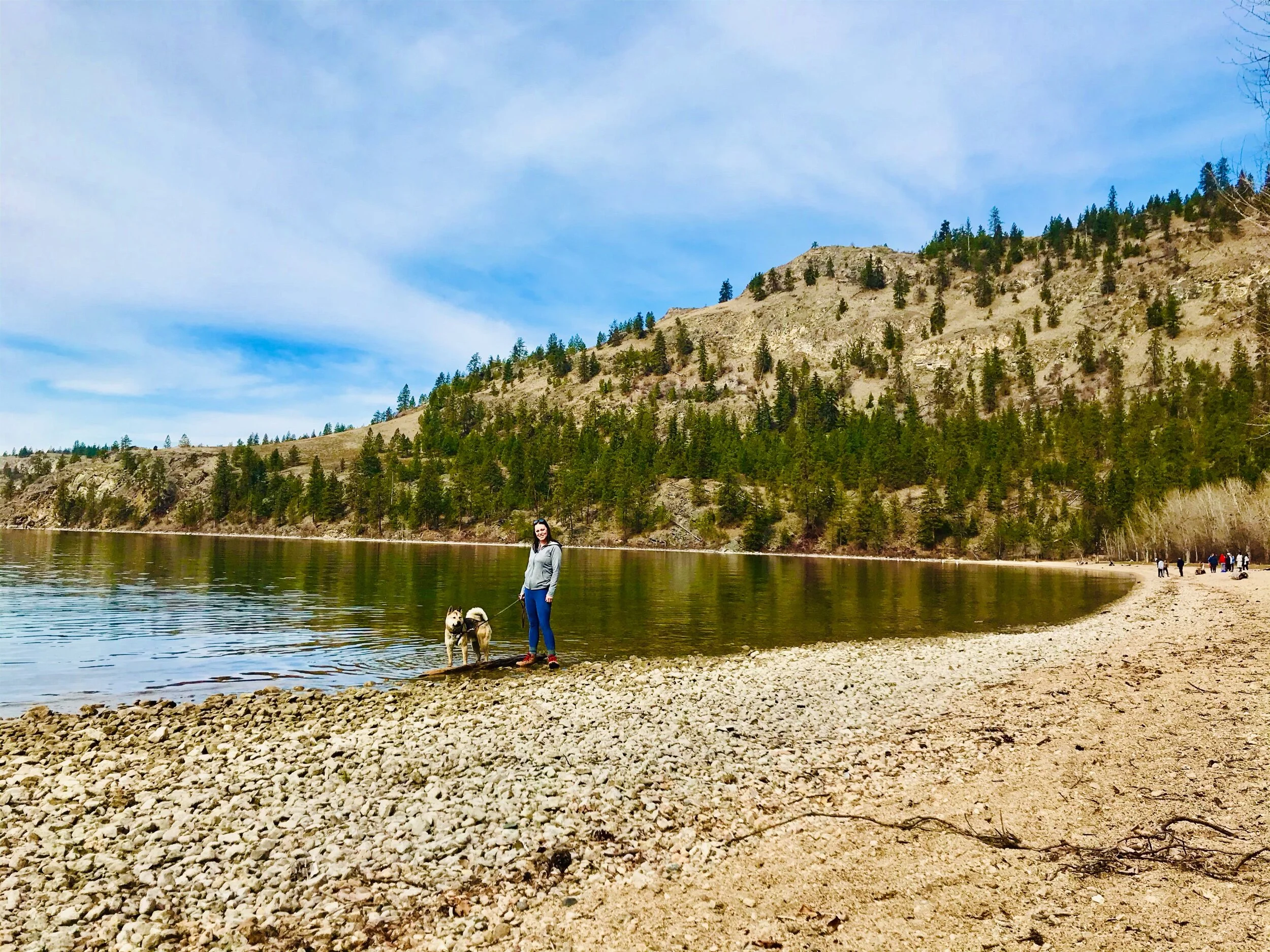 Cosens Bay Trail was a welcoming, sunny, warm, summery hike for us coming from the cooler temps and snow-capped mountains of the Shuswap! We meant to park at a completely different parking lot and hike a completely different trail but got a little mixed up! There are so many trailheads and parking lots in this park! Despite the plans' change, we were just happy to be there and decided to ask a lovely local where we should hike. She pointed us to this beautiful beach trail. We loved the meandering grassland descent down to the water in Cosens Bay and were happy to find a place to let the dog play around. Cosens Bay is a beautiful beach with all the amenities you could expect from a provincial park, including a designated dog beach.